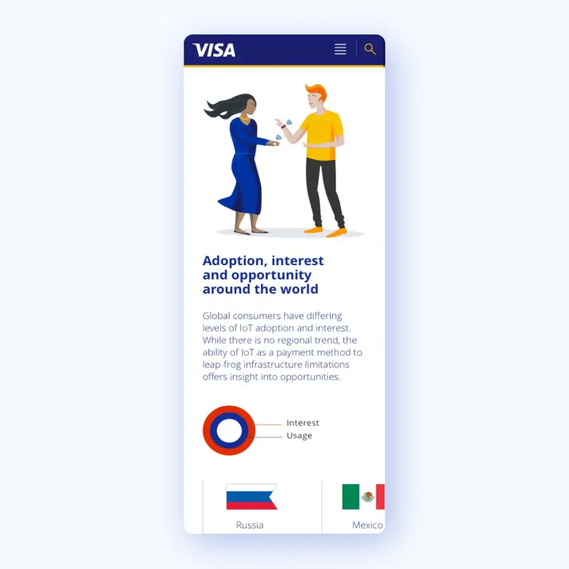 Money makes the world go round. But how is the world making money get around? That’s the question Visa set out to answer in their ambitious international study of payment method usage. Through this annual report, Visa is able to identify trends by country so they can put investment into payment methods with the greatest potential. (Wearables, AR, IoT, etc.) Our job, here at Born & Bred, was to digest this vast, exhaustive information and translate it into data-visualization that felt friendly, intuitive, and—most importantly—Visa. We attentively crafted a color-coding system to keep the visuals simple to navigate. And since it’s an international study, we developed an illustration style with landmarks and people of all cultures. It’s a human touch that keeps the content engaging, personal, and impactful.